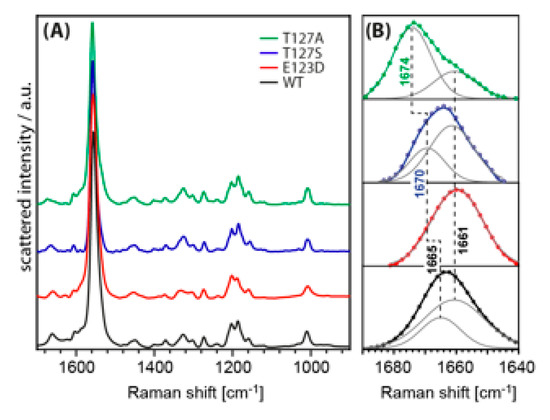 The vibrational band of the Schiff base in WT has so far been treated as a single vibration [32]. In light of our results for the T127A variant, we revisited the Raman spectrum of the WT (Figure 5, black trace). The slight asymmetry in band shape was again considered by fitting two Gaussians, resulting in maxima at 1665 cm−1 and 1661 cm−1.