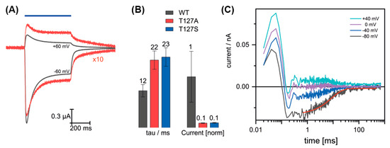 In time-resolved experiments on the T127A variant expressed in HEK293 cells, only very small current amplitudes were recorded. Signals from eight kinetic traces were averaged (Figure 6C) to be able to determine the channel closing kinetics. Similarly to the E123T variant [33] we observed a very fast outward current independent of the holding potential, which monitored a vectorial charge transport within the first 200 µs. The recovery kinetics after pulsed excitation exhibited single exponential behavior with a time constant of 10 ms, which was similar to the WT and consistent with our results from the TEVC recordings.