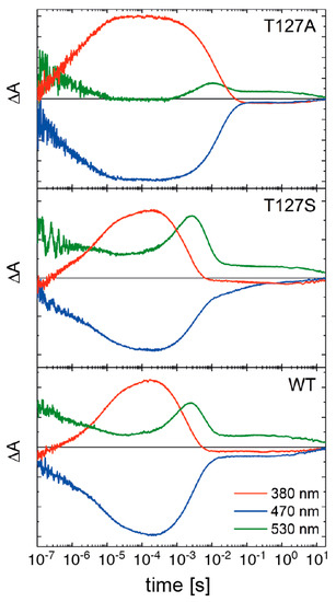 Kinetics in the UV/Vis range recorded after pulsed laser excitation (450 nm). Traces at 380 nm (red lines), 470 nm (blue), and 530 nm (green) are shown for each variant. While the T127A variant (top panel) showed a prolonged lifetime of the P2380 state and reduced P3530 formation, the T127S variant (middle panel) had very similar kinetics to the WT (bottom panel).