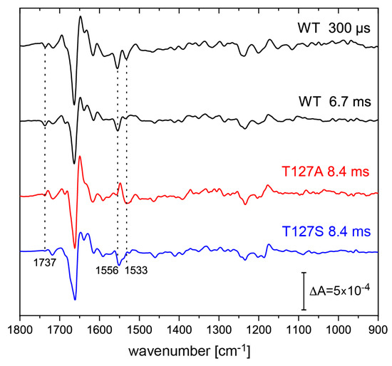 The infrared difference spectra basically confirmed the observations made in the visible spectral range (Figure 6). The low accumulation of the P3530 state in the T127A variant was observed by comparing the difference spectrum at 8.4 ms with the one at 6.7 ms of the WT. The band at 1737 cm−1 assigned to the deprotonation of the proton donor to the Schiff base, D156 [16], was reduced in intensity, which indicated low accumulation of the deprotonated D156 species. This observation was expected as soon as the lifetime of the P2380 state (with deprotonated Schiff base) was extended, as here in the T127 variant. The negative band at 1556 cm−1 in the difference spectra of WT was due to the ethylenic stretching vibration of the retinal in ground-state ChR2 [32]. This band was hardly seen in T127A due to spectral overlap by a positive contribution that is absent in the WT. Instead, a broad negative band at 1533 cm−1 was registered, which was a marker for the contribution of the P4480 photoreaction [35].