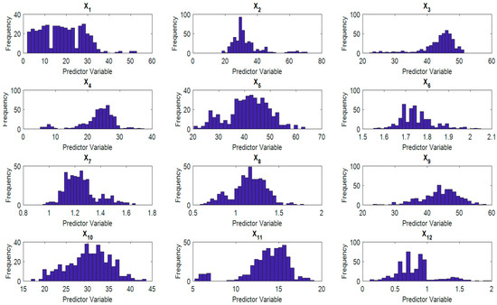 It is noted that 31 boreholes, ranging from 1.8 m to 52.8 m, are used to investigate the geological condition of the study area. The geological survey and laboratory tests in this study were performed according to instructions stipulated in the Vietnam Standards including TCVN9155:2012 (Hydraulic structures: Technical requirements for drilling machines of the geological survey) and TCVN 9140:2012 (Hydraulic structures: Technical requirements for preserving samples in the work on geological investigation). Moreover, the standard penetration test [65] was used to collect data on soil layers. The statistical characteristics of CC’s influencing factors used in this study are shown in Table 1. Table 2 illustrates samples of the collected dataset. Histograms of the variables in the collected dataset are shown in Figure 3 and Figure 4.