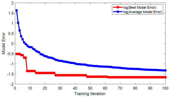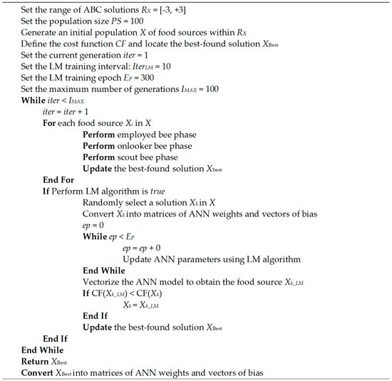 During the model training phase, ABC acts as a global optimizer to guide the population of honeybees to better solutions that represent network structures. Moreover, to accelerate the optimization process, the LM backpropagation algorithm is activated once in ten iterations on a randomly selected solution. With the maximum number of ABC’s iterations set at 100, the LM backpropagation algorithm with the number of training epoch = 300 and the learning rate = 0.01, is activated 10 times to boost the optimization performance. The population size of ABC is chosen to be 100; the lower and upper boundaries of the network parameters, which are the elements of W1, W2, b1, and b2, are selected to be −3 and 3, respectively. The operational training flow of the ABC-LM algorithm is illustrated in Figure 6.