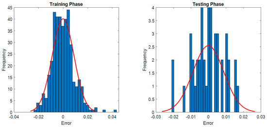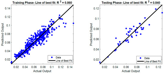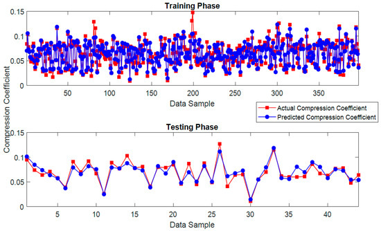 The optimization process of the proposed ABC-LM-ANN is illustrated in Figure 7. It can be seen from this figure that the hybridization of ABC and LM can help the searching process to converge into a good solution of ANN structure within 63 iterations. Beyond this point, no better solution of the ANN structure can be found. The ANN optimized by the LM-ANN can attain a promising predictive result with RMSE = 0.009, MAPE = 10.705%, MAE = 0.007, and R2 = 0.840. With R2 = 0.840 (see Figure 8), the constructed ANN can explain 84% of the variation of the actual CC values. This is a good outcome since the problem of CC estimation, like other problems in the field of geotechnical engineering, is known to be complex. In addition, Figure 9 demonstrates the collected CC values accompanied by the corresponding CC results predicted by the proposed approach and Figure 10 presents the error distribution of the ABC-LM-ANN model in both training and testing phases.