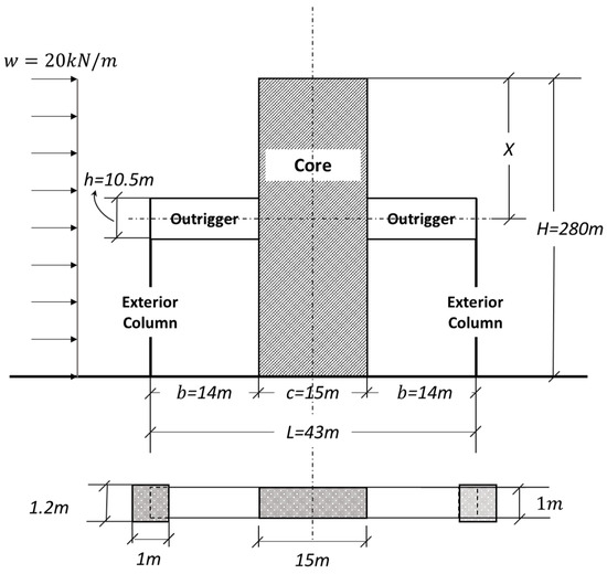 Six models were analyzed to verify the proposed equations. Models A1~A3 were the single-outrigger structures. Model A4 and A5 were the two-outrigger structures. Model A6 included the three-outrigger structures. The overall height of the structure is with story height being equal to 3.5 m with 80 stories. The additional dimensional conditions are shown in Figure 4. The uniform lateral load is applied at the center of the core wall. The floor diaphragm was neglected to assign the same boundary conditions as assumed in Equations (6) and (7). Except for the locations, all outriggers have the same dimensions and elastic modulus of 36.4 GPa. The lateral displacement at the top of the structure and internal shear forces of the outrigger walls from two analysis methods are presented in Table 1. The difference shown in Table 1 is the percentage of the absolute value of the difference between the two results, which is compared to the results from the finite element method. As shown in Table 1, the differences in the top drift and shear forces between two analysis results were less than 5%. A possible explanation for the discrepancy might be that the effective bending stiffness given in Equation (1), in which the clear distance and shear deformation are included, does not represent the actual deformation of the outrigger walls. However, these differences can be regarded as permitted in a structural design practice. Taken together, these results can hold the view that the proposed analytical equations for the outrigger walls that introduce the equivalent bending stiffness are valid.