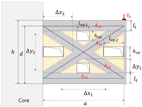 Through geometrical symmetry, the right triangular region was the same as the left one with the length, , and height, . On the other hand, the bottom triangular region was the same as the top one with length, and height, . A half-side outrigger wall has a shear span, , an effective depth, and overall depth of outrigger wall, , as shown in Figure 6. The effective width of the tie, , is equal to and is also a limitation to the location of the top and bottom openings.