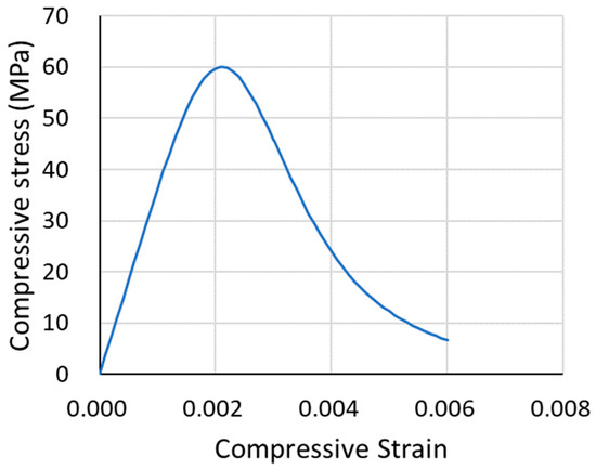 In this study, Abaqus [20], which is a commercial nonlinear finite element analysis program, was used. Several researchers have used Abaqus in analyzing the nonlinear behavior of reinforced concrete structures [21,22,23,24]. The program provides three material models for concrete. These are the smeared crack concrete, brittle crack concrete, and concrete damaged plasticity models. In this paper, the concrete damaged plasticity (CDP) model was used because it can represent the complete inelastic behavior of concrete, both in compression and tension [25,26]. The CDP is a continuum, plasticity-based, damage model for concrete. It assumes that the main two failure mechanisms of concrete material are tensile cracking and compressive crushing, which are represented by the uniaxial tension and compression behavior. Under uniaxial tension, the stress-strain response follows a linear elastic relationship until the value of the failure stress is reached. The failure stress corresponds to the onset of micro-cracking in concrete material. Beyond the failure stress, the formation of micro-cracks is represented macroscopically with a softening stress-strain response, which induces strain localization in concrete structures. Under uniaxial compression, the response is linear up to the value of the initial yield. In the plastic regime, the response is typically characterized by stress hardening, which is followed by strain softening beyond ultimate stress.
