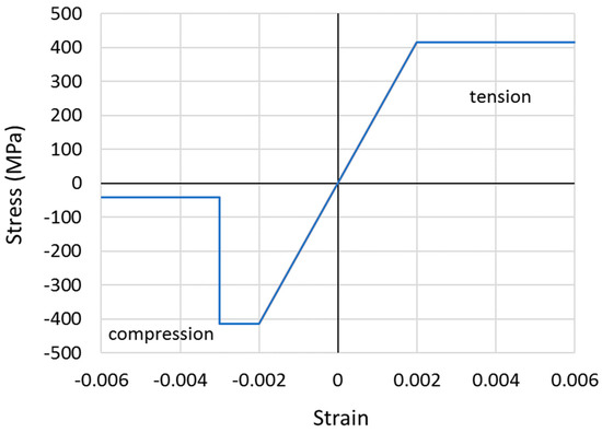 When applying downward force on the loading plate for the analysis model used in this study, the reinforcements with cross-sectional areas and were subjected to compression. On the other hand, the reinforcements with cross-sectional areas and were subjected to tensile forces. To model the behavior of stress reduction caused by buckling in a reinforcement subjected to compression, the material model was defined differently from the material model of the reinforcement subjected to tension. For the reinforcement with cross-sectional areas and , which were subjected to tension, only the yield strength of 414 MPa and modulus of elasticity of 200 GPa were specified by assuming perfect plasticity, as shown in Figure 9. The compressive reinforcements were assumed to be buckled at a compressive strain of 0.003 and reduced the strength to 10% of the yield strength, as shown in Figure 9.