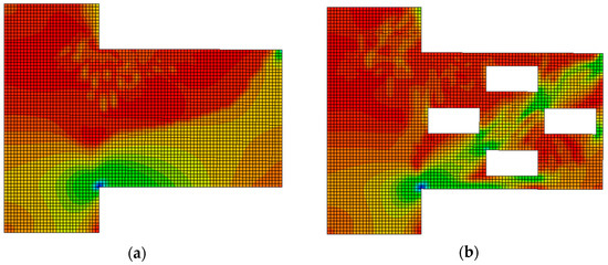 According to American Concrete Institute (ACI) 318–14, the distributed transverse reinforcement should be positioned for compressive strength of concrete not exceeding 42 MPa (6000 psi). However, there is some difficulty in the placement of the distributed transverse reinforcement in an outrigger wall with multiple openings, which is shown in Figure 5. In this study, the compressive strength of concrete that was used in the outrigger walls was greater than 42 MPa in order to evade the requirement for web reinforcement. Therefore, the outrigger wall was reinforced with four main reinforcements along the tension zone. The sectional area of each reinforcement was given by , , and . These reinforcements divide the outrigger wall into four parts, as shown in Figure 6, in which the yellow colored regions were subjected to low stresses. It is essential to install openings in the regions subjected to low stresses.