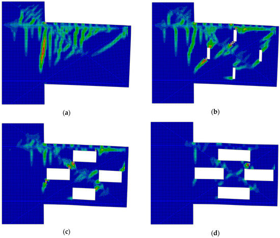 The maximum plastic strain distribution at the ultimate state is shown in Figure 11. The maximum plastic strain represents the tensile strain in concrete, and the distribution shows the crack pattern of the analysis models. In the M0 model, the widest crack developed in the flexural critical section at which the outrigger wall meets the core wall. Several flexural cracks developed along the top reinforcement. The diagonal crack initiated at the loading plate and developed along the diagonal reinforcement, which was subjected to compression, was also noticeable. In model M1, many cracks developed along the top and diagonal reinforcements, which were subjected to tension. It was also noticed that wide local cracks were developed at the bottom left corner of the openings. In M8, the crack initiated at the loading plate and propagated along the top reinforcement, which formed a large arc along the corners of openings. In M11, in which the compressive struts interfered by the openings, the ultimate state developed by the local failure at the corners of the top and right openings.