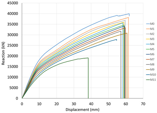 Figure 12 shows the relation between the applied vertical displacement and total vertical reactions measured at the pinned nodes from the nonlinear analysis. It can be clearly observed that the outrigger walls experienced a progressive decrease in both stiffness and strength as the size of the opening increased. However, the ultimate displacement of all the models, except M11, were around 60 mm and the initial yielding was developed at about 10 mm.