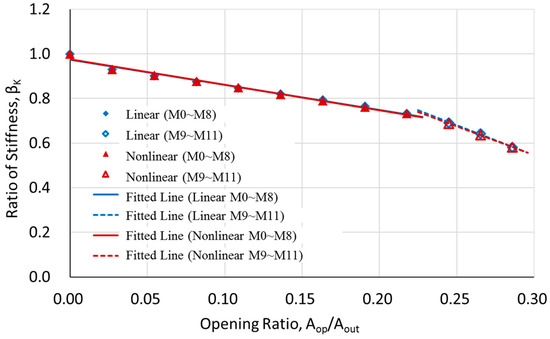 Figure 13 shows the degradation ratios in stiffness as the size of the opening increases. The ratios of the stiffness decline almost linearly with a gentle slope from M0 to M8. When the opening area exceeds 22% (M8), the decreasing trends are also regarded as being linear, but they become steeper. From the similar trends in the results of linear and nonlinear analyses, it can be concluded that the loss of area due to multiple openings is a more influential factor on the stiffness of outrigger walls than the material degradation.