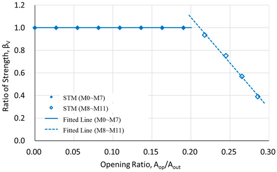The indices representing the relative strength degradation as increasing the size of the openings are presented in Figure 16. It can be observed that the remained 1.0 before the opening ratio reached 19% (M0–M7). This means that the steel reinforcements yielded before the failure of concrete until the size of the openings reached 19%. When the size of the openings increased beyond 19%, the openings reduced the width of the strut and, consequently, reduced the strength of the strut and strength of the outrigger walls. The strength ratio began decreasing sharply from model M8 and dropped to 39% in model M11. These results indicate that the failure of concrete preceded the yielding of reinforcements in model M11. When comparing Figure 14 from the nonlinear finite element analysis and Figure 16 from the strut-and-tie model, it can be noticed that the strut-and-tie model is not conservative in predicting the shear strength of outrigger walls with low opening ratios.