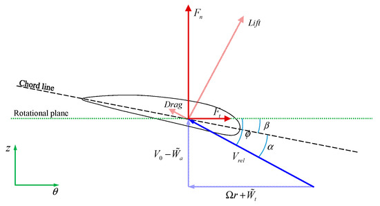 With the determined angle of attack and relative velocity, the lift coefficient and drag coefficient of each cross-section of the blade can be obtained from tabulated airfoil data. According to the relationship of force projection, the normal and tangential force coefficients are determined by