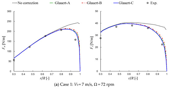 It is seen in the result of Case 1, as shown in Figure 8a, that the full CFD result achieves the best agreement with the experimental data and the new correction is superior to the Glauert-C correction. As compared to the Glauert-C correction, the overestimation of Fn in the tip region is properly corrected towards the reference data by the new correction. A similar tendency is seen from the tangential force distribution. In Case 2, as shown in Figure 8b, the new correction maintains its accuracy, while the Glauert-C correction produces larger positive error, due to the occurrence of flow separation. The performance of the two corrections is similar to those in BEMT computations [33].