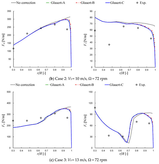 It is noticed that there is a certain degree of difference between the results of the Glauert-A/B/C corrections in the tip region (e.g., at r/R > 0.8). In general, Glauert-C leads to lower loads which are closer to the experimental data, Glauert-A gives results close to, but slightly higher than, those of Glauert-C, while Glauert-B results in relatively higher loads near the tip. Taking the in Figure 4a as an example of quantitative comparison, the relative difference between the results of Glauert-B and Glauert-C is about 4% at r/R = 0.95. The difference in other cases is not larger than this value.