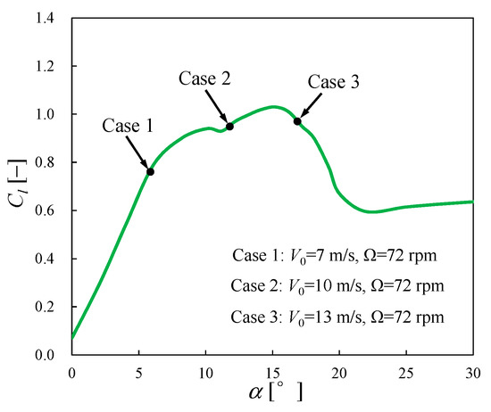 Considering the fact that the Glauert correction was derived based on the potential hypothesis, it is reasonable to believe that the unusually poor performance at the higher wind speed is caused by the flow separation. According to the results of the NREL UAE Phase Ⅵ experiments [50], the angle of attack at most cross-sections of the blade exceeds the linear range of their aerodynamic polar when the wind speed is increased to be higher than 10m/s. Taking the cross-section of r/R = 0.63 as an example, the angles of attack are 5.9°, 11.8°, 16.9° at a wind speed of 7 m/s, 10 m/s, 13 m/s, respectively. The exact operating points for three cases on the lift polar of the S809 airfoil (the airfoil of all cross-sections of the NREL Phase Ⅵ blade) are depicted in Figure 5. It clearly shows that Case 2 and Case 3 are in the nonlinear lift region corresponding to flow separation, while Case 1 is in the linear lift region corresponding to attached flow, which implies that flow separation occurs at 10 m/s and 13 m/s.