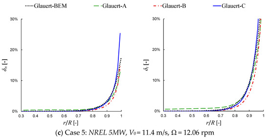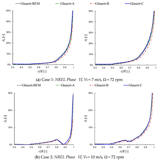 where and are the axial velocity obtained from the simulations using the new tip loss correction and the Glauert-C tip loss correction, respectively.