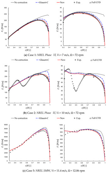 The simplified form (see Section 3.2) of the new correction developed by Zhong et al. [33] is used in the present simulations. The results of blade loads for Cases 1, 2 and 5 are displayed in Figure 8a–c, respectively. Case 1 represents a typical condition of the NREL Phase Ⅵ wind turbine with the fully attached flow on its blades, while Case 2 represents another condition of flow separation (stall). Case 5 represents the rated operating condition of the NREL 5MW wind turbine. The results for Cases 3 and 4 are not displayed here for simplicity. (The performance of the correction in Case 3 is similar to that in Case 2, while the performance in Case 4 is similar to that in Case 5.) The Glauert-C correction, which performs best in Glauert-A/B/C, is compared with the new correction. Full CFD results [33] are employed as the reference data for the NREL 5MW wind turbine. As compensation for the sparse points of the experimental data, full CFD data [8,33] are also employed for the NREL Phase Ⅵ wind turbine.
