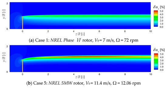 Figure 9 displays the contours of in the flow field of the studied two rotors, which highlights the influence of the tip loss corrections in terms of changing the velocity field not only around the blade tip, but also in the wake. The influence of is more concentrated near the blade tip in the rotor plane, whereas, the inner part is hardly affected. In the wake, the influence range of tends to cover a wider radial space downstream. The magnitude is even increased in the wake of the NREL 5MW rotor.