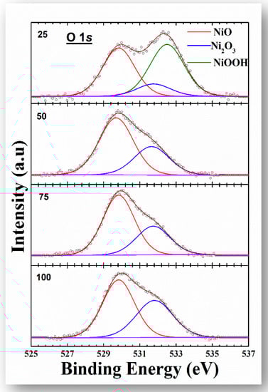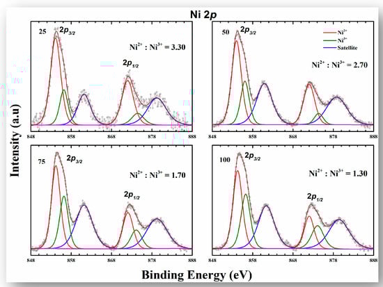 The data presented in Table 3 were acquired from the survey spectrum and shows a consistent decrease in oxygen content at the surface. This finding could be of interest, as the decreased concentration of oxygen may lead to bridging of the oxygen structures in the NiO lattice. Table 4 shows the binding energy values of the Ni2+ and Ni3+ states in the Ni 2p spectra of the XPS analysis.
