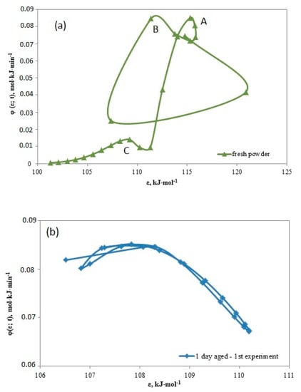 Figure 9a–c depicts the rough aspect of the surface heterogeneity of the powdered catalyst S-27 (75 mL of water in the initial mixture): fresh catalyst and 1 day aged catalyst (first and second experiment) through the distribution density function of the local adsorption energies over energy.