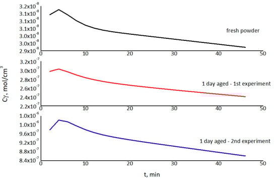The time–variation curves of the equilibrium adsorbed concentration (cy) are depicted in Figure 10, where a linear regression fit was attempted in each case. It appears that the highest gradient appeared for the 1 day aged catalyst from the second experiment and the lowest for the 1 day aged catalyst from the first experiment. This fact, as well as the fact that the highest values for the equilibrium adsorbed concentration were measured for the catalysts, allows for determining the apparent activity ranking of these types of catalysts as follows: fresh > 1 day aged first experiment > 1 day aged second experiment. Rapid reduction of the non-adsorbed hydrogen concentration in the second experiment in comparison with first experiment can be connected to the different compositions of the catalysts because of the partial reduction NiO to Ni during the first experiment. It is known that the oxide reduction temperature depends on the particle size, and the usual temperatures for reduction are 300–500 °C. Nano nickel oxide can be reduced at temperatures even less than 100 °C [,].