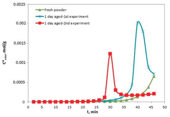 Figure 11 exhibits the influence of aging on local monolayer capacities, and it describes how Csmax changes with the catalyst aging. Thus, in the case of fresh catalyst and aged catalyst, the local monolayer changed 2–3 times. The tmax in the latter case was 50, 40, and 30 min, respectively. Therefore, the monolayer capacity and the time of its maximum was a function of aging time.