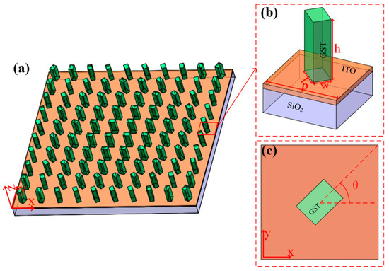 (a) Structure arrangement diagram of the unit cell. (b) The overview of the unit cell. The patterned Ge2Sb2Te5 (GST) is settled on the substrate, and a 20 nm thin indium tin oxide (ITO) conductive layer is sandwiched between the GST and substrate. The structure parameters are p = 3 μm, l = 1 μm, w = 0.7 μm, and h = 2.5 μm. (c) The top view of the unit cell. The patterned GST forms an angle θ with the x axis.