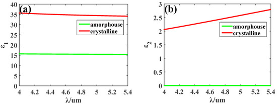 (a) The real part of permittivity for amorphous GST and crystalline GST. (b) The imaginary part of permittivity for amorphous GST and crystalline GST.