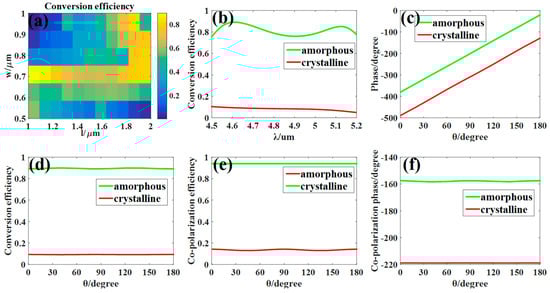 However, the parameters of the unit cell need to be designed carefully to satisfy the tuning function. When the patterned GST is in an amorphous state, the conversion efficiency from LCP to RCP should be high enough and the phase modulation should strictly satisfy the linear relationship of . When the patterned GST is in a crystalline state, the conversion efficiency from LCP to RCP should be low enough. Due to the low conversion efficiency, the corresponding phase modulation relations can be ignored. The simulation of the unit cell was performed using the finite-element method in the frequency domain with the unit cell boundary in the xy direction and the open boundary in the z direction. In the simulation, the incident LCP was settled propagating along the +z direction through the substrate. The GST data were obtained from the experimental data in [37], where the dielectric function ε(ω) was investigated by infrared spectroscopy and spectroscopic ellipsometry. The big differences of ε(ω) between amorphous GST and crystalline GST at the wavelength of 4~5.4 μm are shown in Figure 2. Considering that the parameters p, l, w, and h are designed to determine the conversion efficiency, we needed to sweep the parameters, picking up the parameters where the conversion efficiency was high enough. Due to the four freedom, the data are complicated. Here, only the conversion efficiency versus l and w is depicted in Figure 3a, when p was fixed as 3 μm and h is fixed as 2.5 μm. Finally, the parameters of the unit cell were determined as p = 3 μm, l = 1 μm, w = 0.7 μm, and h = 2.5 μm. Figure 3b shows the relationship between the conversion efficiency from LCP to RCP and wavelength when GST is in amorphous state and crystalline state. The conversion efficiency exceeded 75% in the whole range from 4.5 μm to 5.2 μm when GST was in an amorphous state, while it was less than 10% for crystalline GST. At the designed wavelength of 4.6 μm, when the angle changed from 0 to π, the phase modulation of the unit cell for both GST states are shown in Figure 3c. While the GST was in an amorphous state, the abrupt phase covered the whole 2π range linearly. Figure 3d shows the relationship between the conversion efficiency and rotating angle θ. When the conversion efficiency for amorphous GST was as high as 89.1%, while the conversion efficiency for crystalline GST was only 9.2%. When the angle changed from 0 to π, the conversion efficiency hardly changed for both GST states, which proves the high stability of the unit cell. In contrast, the co-polarization efficiency was considerably high (94%) when GST was in a crystalline state, while the co-polarization efficiency was only 14% for the amorphous state, as shown in Figure 3e. Figure 3f proves that the co-polarization light does have any phase modulation, as the theory predicted. This means that the incident light can pass through the unit cell just like passing through a transparent dielectric when GST is in a crystalline state. All the simulation results showed that the designed unit cell can very well meet the requirements of tunable function.