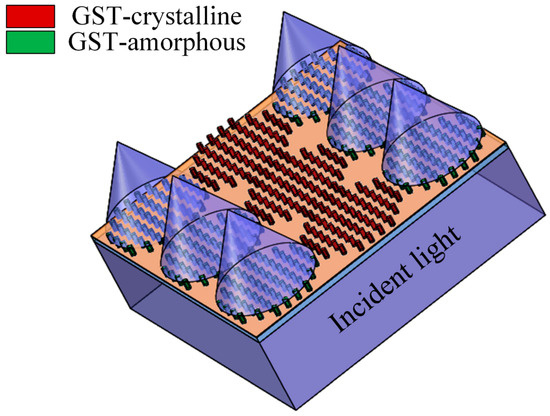 The diagram of the tunable metalens array. The green blocks represent amorphous GST, which can focus the incident light, and the red blocks represent crystalline GST, which cannot focus the incident light. By actively tuning the phase state of GST, the performance of the metalens array can be controlled.
