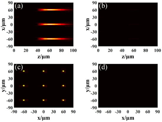 (a,b) The light field in the xz plane for the metalens array when all GST are in an amorphous state and crystalline state. (c,d) The light field in the xy plane for the metalens array when all GST are in amorphous and crystalline states.