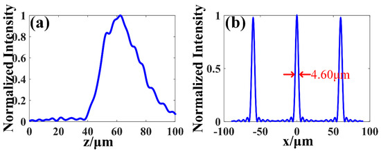(a) The normalized intensity of the light field along the z axis when x = y = 0 for amorphous GST. (b) The normalized intensity of the light field along the x axis at the focal plane when y = 0. The FWHM is 4.60 μm.