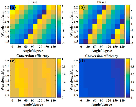 (a,b) The abrupt phase variances with the wavelength and rotating angle when GST is in the amorphous state or crystalline state. (c,d) The conversion efficiency versus wavelength and rotating angle when GST is in the amorphous state or crystalline state.
