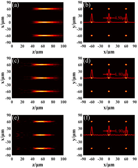It is clear that one of the advantages of designing with the P-B phase shift is that it has a broadband response. Figure 7a shows the abrupt phase as a function of wavelength and rotating angle when GST is in the amorphous state. The results prove that the abrupt phase can still linearly cover the 2π range in the whole wavelength range from 4.5 μm to 5.2 μm. Figure 7b shows the phase variance with wavelength and angle when GST is in the crystalline state. At the same time, big differences in the conversion efficiency between the amorphous state and crystalline state still exist, as shown in Figure 7c (amorphous state) and Figure 7d (crystalline state), which proves that the tuning ability of the metalens array remains functional. For instance, when the incident lights were 4.5 μm, 4.85 μm, and 5.2 μm, the light fields of the metalens array in the xz plane are shown in Figure 8a,c,e. It is clear that the metalens array focused the three wavelengths of light, although it was designed at the wavelength of 4.6 μm. The focal length for the three wavelengths were 63.2 μm, 58.2 μm, and 53.6 μm separately, and it is reasonable that the focal length decreases with increasing wavelength, according to Equation (1). The light fields in the focal plane and the normalized intensity along the x axis for the three wavelengths are shown in Figure 8b,d,f. The FWHM of the spots in the focal plane were 4.50 μm, 4.80 μm, and 4.90 μm, respectively, indicating that all of them break through the resolution limit for a conventional lens. Similar effects can be observed across the whole range while the focusing efficiency stayed above 50%, which proves the excellent broadband focusing performance of the designed metalens array.