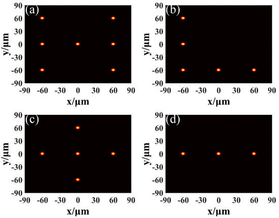 However, the proposed actively tunable metalens array not only acts as the focusing metalens array or transparent dielectric, but also contributes in the dynamic display area. The switching speed for GST is very fast (nanosecond or less) when the electrical or optical tuning method is adopted [29]. By controlling the phase state of GST instantaneously, any spot distributions can be obtained. Figure 9a–d show the focused graphics of letters and symbols “H”, “L”, “+” and “−” with the same metalens array. When the metalens array is large enough with N N unit cells, more complicated graphics can be formed in the focal plane. Benefitting from the ultrafast switching speed of GST and high resolution of the metalens, the proposed actively tunable metalens array may have great application potential in the dynamic display field.