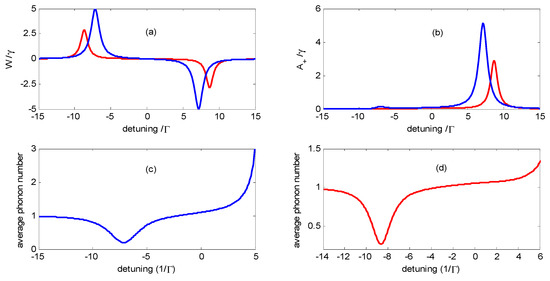 Firstly, we investigate the variation range of the parameters and , and the influence on the average photon number . The parameters in this paper are assumed with reference to the typical experimental parameters [43,44]. In Figure 2, the parameters , and are plotted as a function of the driving detuning for different driving Rabi frequencies of the external microwave field. This shows that the sign of the W exhibits a dependence on the detuning. W is at maximum when and at minimum when , while is at a maximum when . One can also find that the average photon number of the microwave cavity in a steady state is at minimum when W is at maximum and it increases to infinity when . Additionally, could be less than the photon number of the thermal reservoir when , while it could be more than when . Figure 2 also shows that the parameters , and are dependent on the driving Rabi frequency.