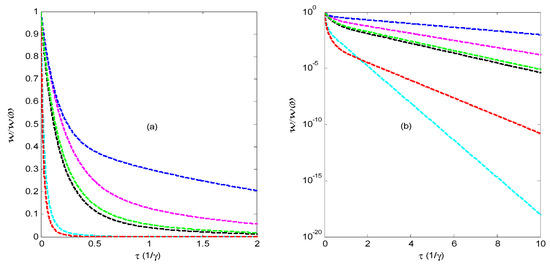 (a) waiting time distribuitions (WTDs) as a function of waiting time for different parameters. (blue line); (green line); (red line); cavity without DQDs (black line); DQDs replaced by thermal bath (cyan), thermal bath (magenta); , , , , , ; (b) the same curves as (a) on a logarithmic scale.