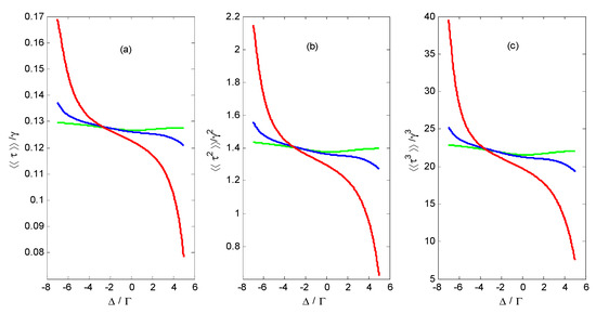 The first-order (a), second-order (b) and third-order (c) cumulants of waiting time as function of detuning. , (red line); , (blue line); , (green line); , , , .