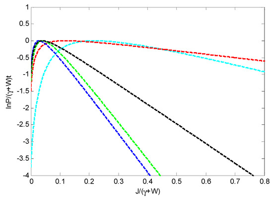 Figure 6 exhibits large-deviation statistics of the net photon emission current as a function of the net photon emission current J from the cavity to reservoir. From the black line, we see that the probability of the photon emission energy current moving from the cavity to the thermal reservoir is the same as that of the photon emission current from the thermal reservoir to the cavity because the system is in steady state. The blue line and green line show that, if average photon number of the cavity satisfies the condition > , the photon emission energy current will flow from the thermal reservoir to the system of the DQDs; otherwise, the photon emission energy current will flow in the opposite direction. As for the red line (, W < 0) and the magenta line (), the photon emission current from the thermal reservoir to the cavity are suppressed, which is quite different from that of the other cases. In particular, the most probable photon emission current is shifted from zero to a positive photon emission current J for the red line (, W < 0).