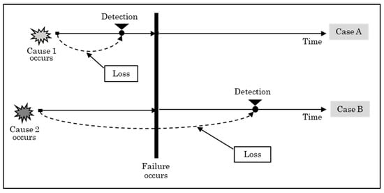 Consider a random variable as an elapsed time from a failure-cause to the failure occurrence. Likewise, the detection time is defined by the elapsed time between a failure-cause and its detection. By defining an appropriate loss function as a function of the occurrence time and detection time , the expected loss can be calculated accurately. A typical failure scenario is depicted in Figure 1.