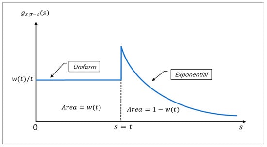 Now, set up the following variables for obtaining the exact probability density function of detection time. Let us consider a failure and its failure-cause. Here, is the elapsed time between occurrence and detection of the failure-cause. Similarly, is the elapsed time between occurrence of failure and that of its failure-cause. As mentioned before, the conditional probability density function is uniform in the domain where a detection time is less than the given occurrence time . Otherwise, has an exponential form. Next, we have to determine the weight of the uniform and exponential section among the total probability 1. Let be the cumulative probability of the uniform distribution; then, is the cumulative probability of the exponential distribution as shown in Figure 3. Thus, the conditional probability density function is expressed as a function of the failure-cause detection rate , given the failure occurrence time .