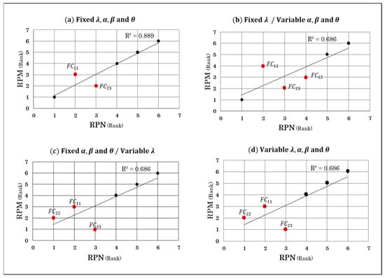 To illustrate the effectiveness of the proposed risk-evaluation technique, the above-described case study was used to analyze and compare results obtained using the proposed TD-FMEA model and conventional design FMEA techniques. The results are described in Table 3, that lists values of the conventional RPN, proposed RPM, and E[L] for each probable failure-cause in terms of both score and priority. To facilitate the robust evaluation of risks during the case study, results obtained for four cases ((a)–(d)) have been discussed herein considering, in each case, the effect of variation in the value of any one parameter among and . Figure 4 shows the correlation of priority of RPN and RPM in Table 3, respectively, in four cases. The square root of is 0.8 or higher, it is determined that there is a strong correlation [31]. The square root of always satisfies , the positive correlation is , the negative correlation is . Moreover, when it is free, it becomes .