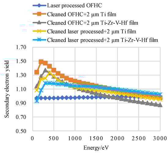 The SEY properties of laser processed OFHC, Ti film, and Ti–Zr–V–Hf film coatings with OFHC and laser processed OFHC substrates are shown in Figure 5. When the primary electron energy varied between 100 and 3000 eV, the maximum SEYs (δmax) of Ti film coating and Ti–Zr–V–Hf film coatings with OFHC substrates were 1.49 and 1.37, respectively, with the corresponding primary energy (Emax) of 200 and 300 eV, respectively. The δmax of Ti and Ti–Zr–V–Hf film coatings with laser processed OFHC substrates were 1.34 and 1.18, respectively. The δmax of as-received OFHC samples were 1.6–2.0 [19,21,22] with different polish states and SEY test parameters. It can be seen that the δmax of Ti and Ti–Zr–V–Hf film coatings with laser processed OFHC substrates are lower than the ones of as-received OFHC samples.