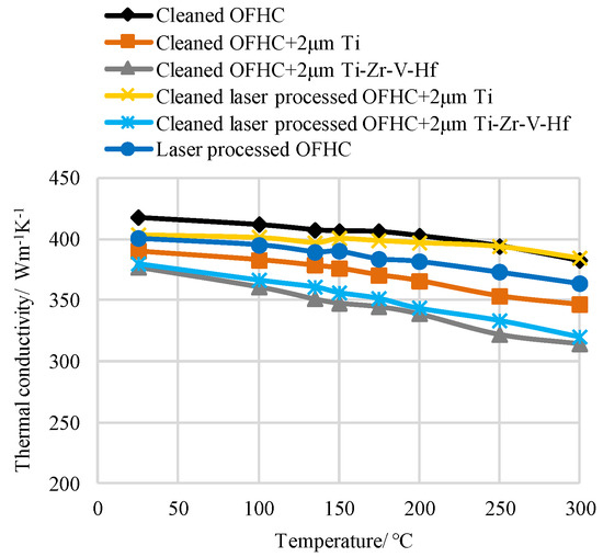 Figure 6 shows that the thermal conductivities of Ti films with cleaned laser processed OFHC substrates are higher than the ones with cleaned OFHC substrates. In particular, when the test temperatures are 250 and 300 °C, respectively, the thermal conductivities of cleaned OFHC and Ti films with cleaned laser processed OFHC substrates are very close. Concurrently, the thermal conductivities of Ti films with cleaned laser processed OFHC substrates are higher than the ones with cleaned OFHC substrates. However, the thermal conductivities of Ti–Zr–V–Hf films with cleaned untreated OFHC and laser processed OFHC substrates are equivalent to a certain degree.
