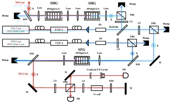 The experimental scheme is shown in Figure 1. The first master-oscillator power fiber amplifier (MOPFA) consists of a compact distributed feedback (DFB) diode laser at 1560.5 nm and a 10 W EDFA, and another MOPFA consists of a compact DFB at 1878.0 nm and a 2 W TDFA. The optical isolator is used to restrain the laser feedback, thus ensuring the stability of EDFA and TDFA. The half-wave plate (λ/2) and the polarization beam splitter (PBS) cube are used to control the power of the 1560.5 nm and 1878.0 nm lasers, while also transforming the polarization of the fundamental lasers to the s polarization to meet the requirement of the sum-frequency process. Then, a 50 mm-long PPMgO:LN crystal (HC Photonics; Taiwan; the thickness is 0.5 mm; poling period of 23.4 μm; type 0 matching; both ends of the crystal have flat surfaces with anti-reflection coatings for the fundamental and sum-frequency laser, and the residual reflectivity R < 0.2%) is used as the SFG crystal. Additionally, the crystal is placed in a homemade oven, which is made of red copper and stabilized at a precise temperature using a temperature controller (Newport Corp., California, America, Model 350B). We can achieve optimized phase matching by adjusting the temperature of the crystal. Matching is an important factor in a single-pass configuration [21]. We choose f = 100 mm and f = 75 mm with anti-reflection coating for both fundamental and sum-frequency lasers as the matching lens. After the laser passes through the crystal, a 75 mm lens is used to collimate the output laser. Subsequently, the 852.3 nm laser is divided into two beams by PBS: one beam passes through Cs atomic vapor cells and another beam passes through the Fabry–Perot cavity to monitor its frequency tuning range.