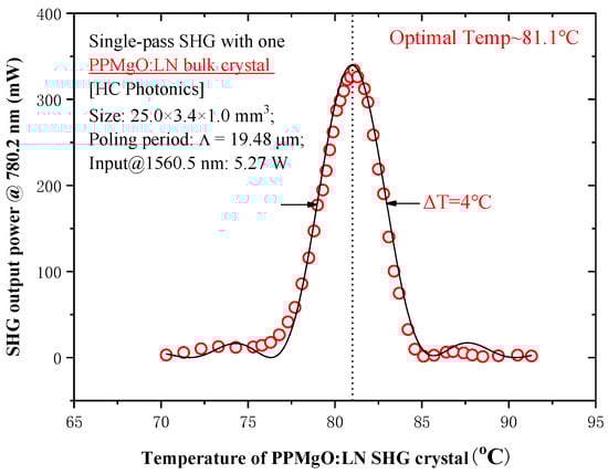 First, on the basis of our previous experiment, we find the optimized phase matching by adjusting the temperature of the PPMgO:LN crystal in a single-pass SHG experiment. When the power of the fundamental wave 1560.5 nm is 5.27 W, the best phase matching of the PPMgO:LN-crystal is found at a temperature of 81.8 °C. The results are shown in Figure 2.