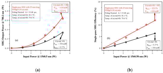 Experimental data for single-pass second-harmonic generation (SHG) output (a) and the frequency doubling efficiency (b). The squares represent the case using one PPMgO:LN bulk crystal, and the circles represent the case using two cascaded PPMgO:LN bulk crystals.