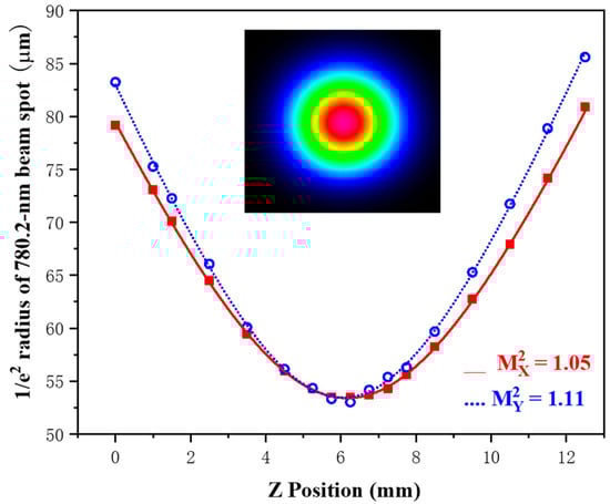 The transverse beam quality of the 780.2 nm laser is evaluated by using the beam quality factor parameter () in the two orthogonal transverse directions X and Y. Figure 4 shows the 1/e2 beam radius versus the axial position Z after passing through a plano-convex lens with a focal length of 80 mm. Fitting of the experimental data gives = 1.05 and = 1.11.