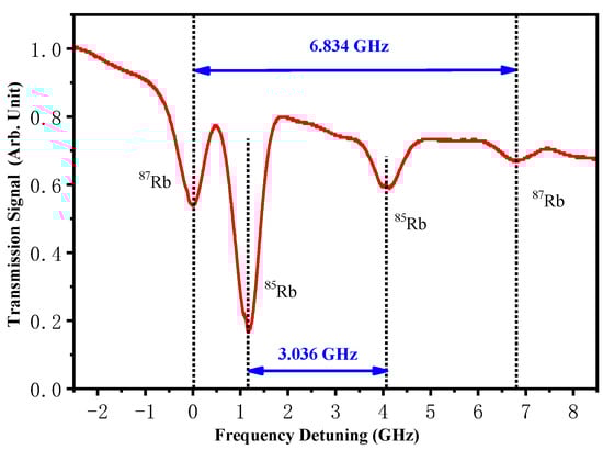 We evaluate the frequency tunability of the 780.2 nm output by measuring the absorption spectra of Rb atomic vapor cells, while the 1560.5 nm fundamental laser frequency is scanned linearly. Figure 5 shows the Doppler-broadened absorption spectra of the 5S1/2–5P3/2 transition (D2 line) for 87Rb and 85Rb atoms. These spectra indicate that the continuously tunable range of the doubled laser at 780.2 nm is at least 6.8 GHz.